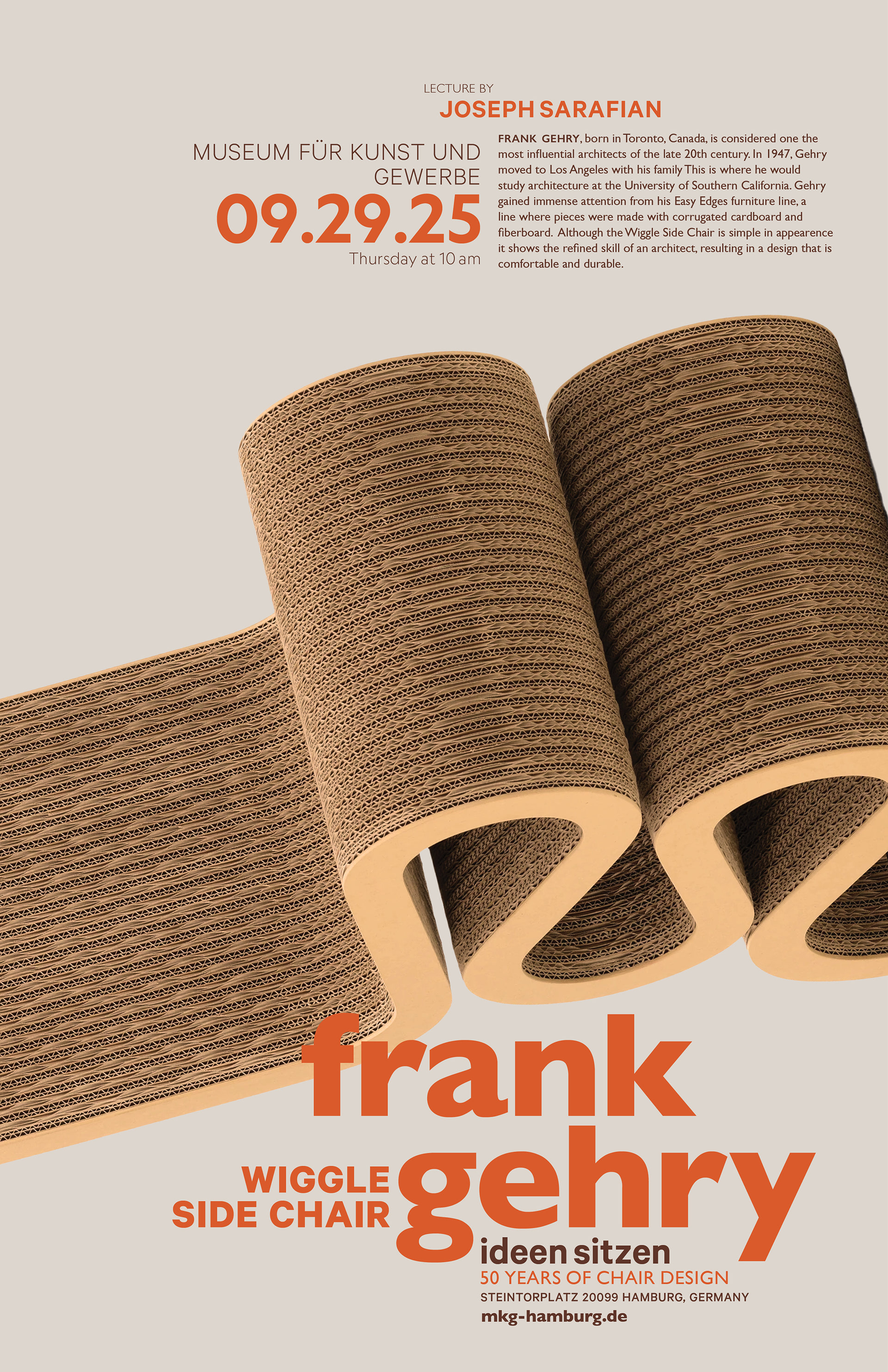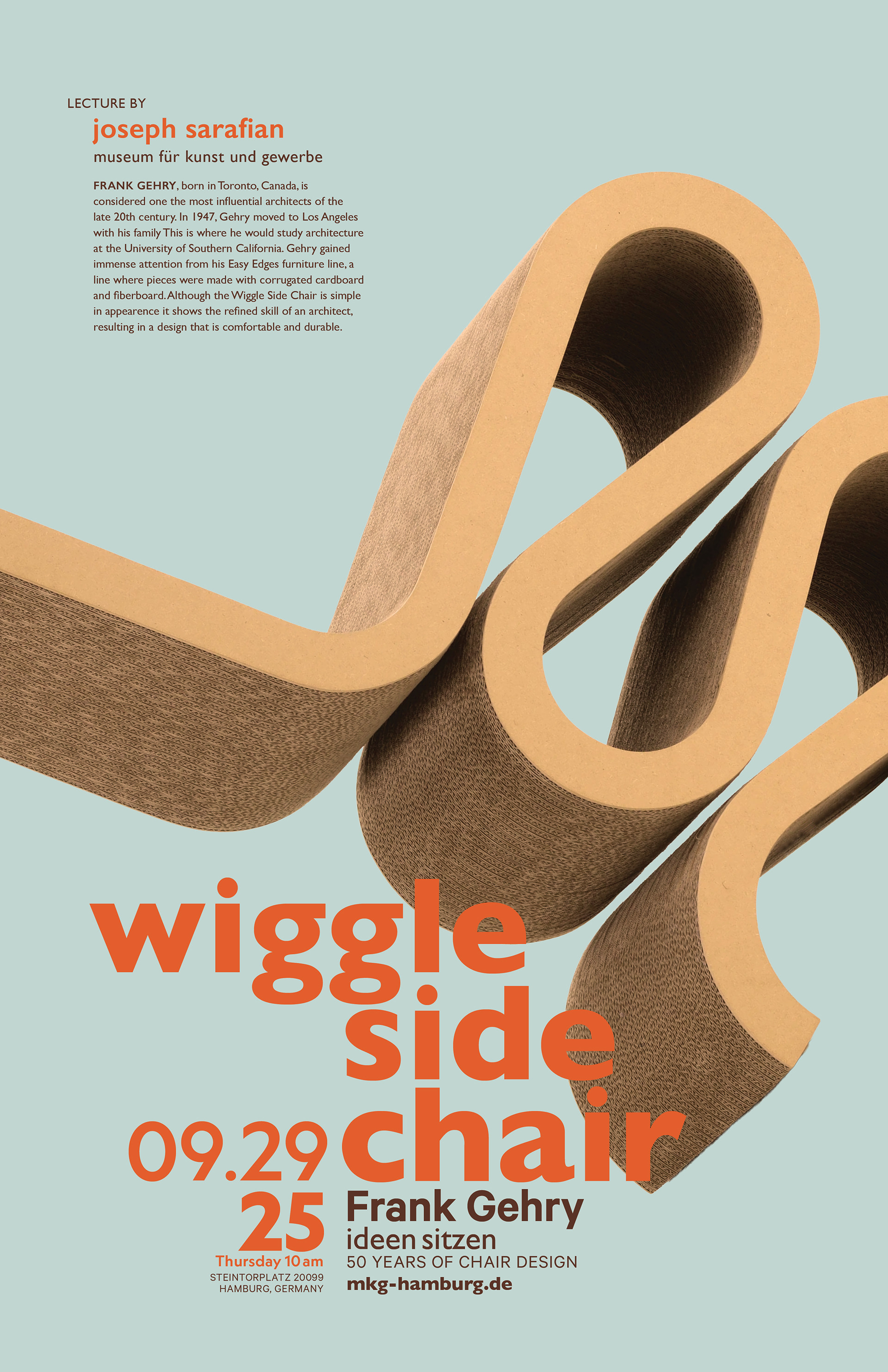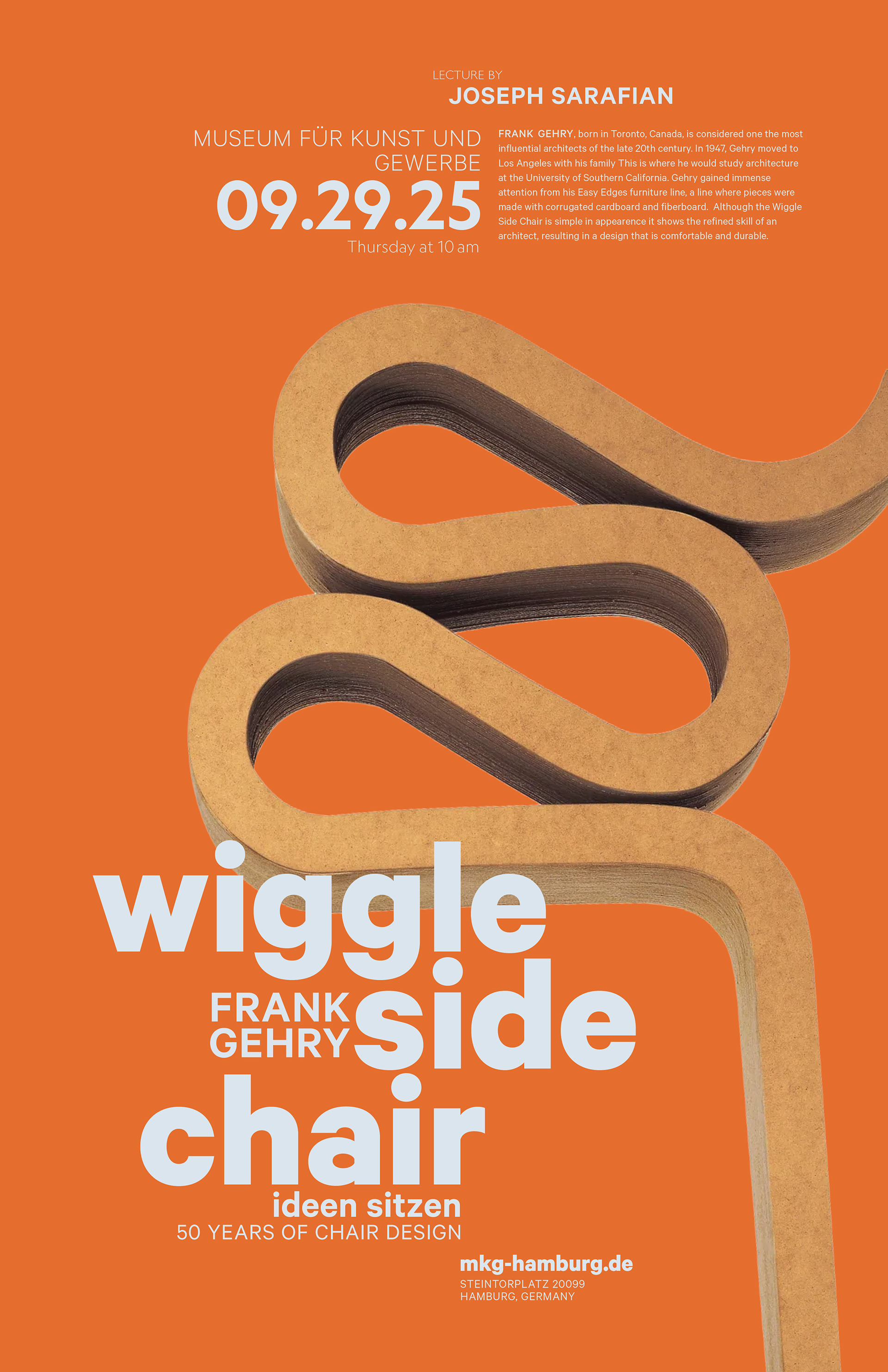 Poster design featuring Frank Gehry's Wiggle Side Chair, exploring movement, materiality, and form.
